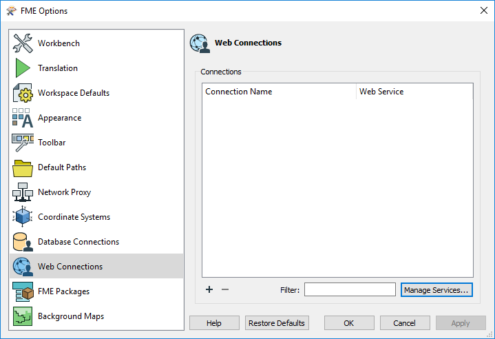 Sélectionner l'onglet Web Connections, puis cliquez sur Manage Services….