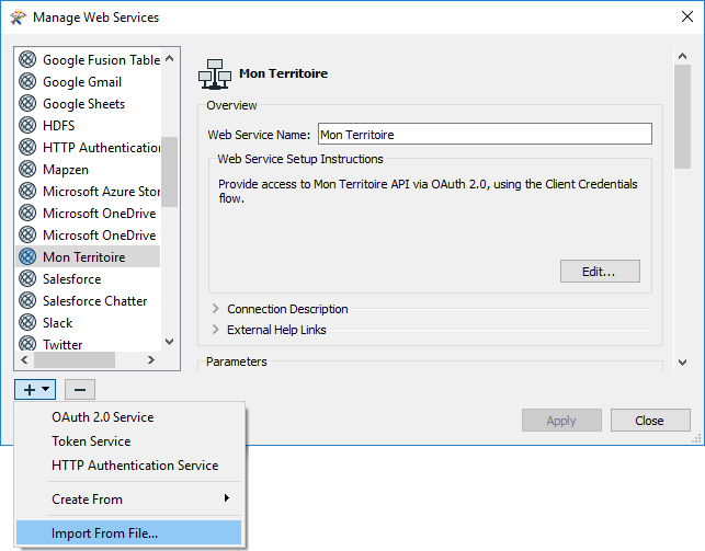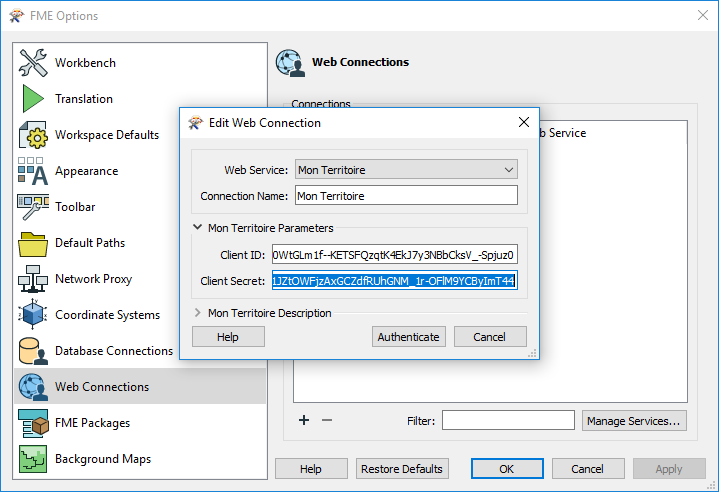Toujours dans l'onglet Web Connections des options de FME, ajoutez une nouvelle connexion, sélectionnez le service Mon Territoire et complétez avec vos identifiants fournis dans l'Atelier Serveur.