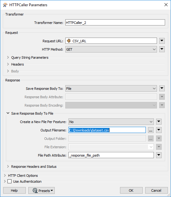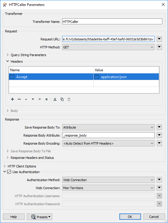 | Request URL | L'URL du dataset, disponible dans l'Atelier Serveur, avec le paramètre ?csv |